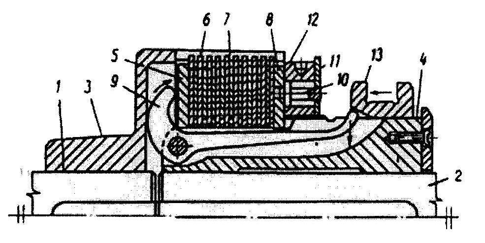 Vnitřní i vnější lamely jsou vystřídané a jsou stlačené zadním kroužkem 5 k přednímu přítlačnému kroužku 8, který je nastavitelný matici 12. V matici je pojistka 10 s pružinou