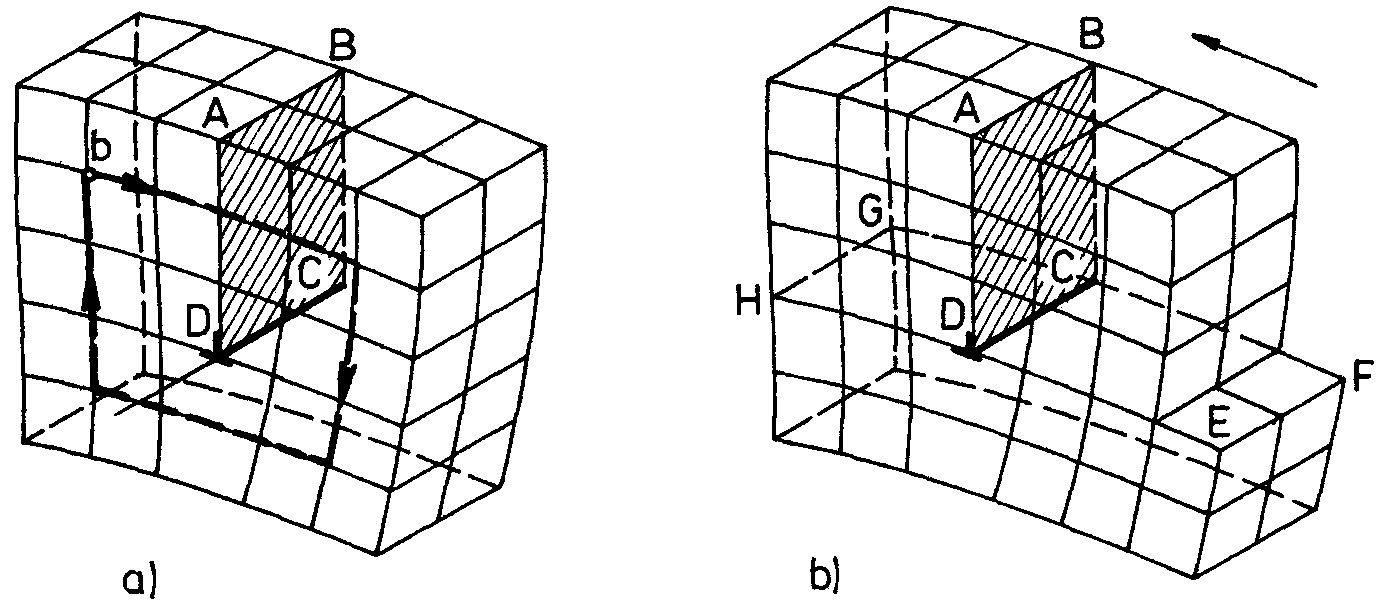 Modely hranové dislokace (a, b) a) postup určení jejího Burgersova vektoru b